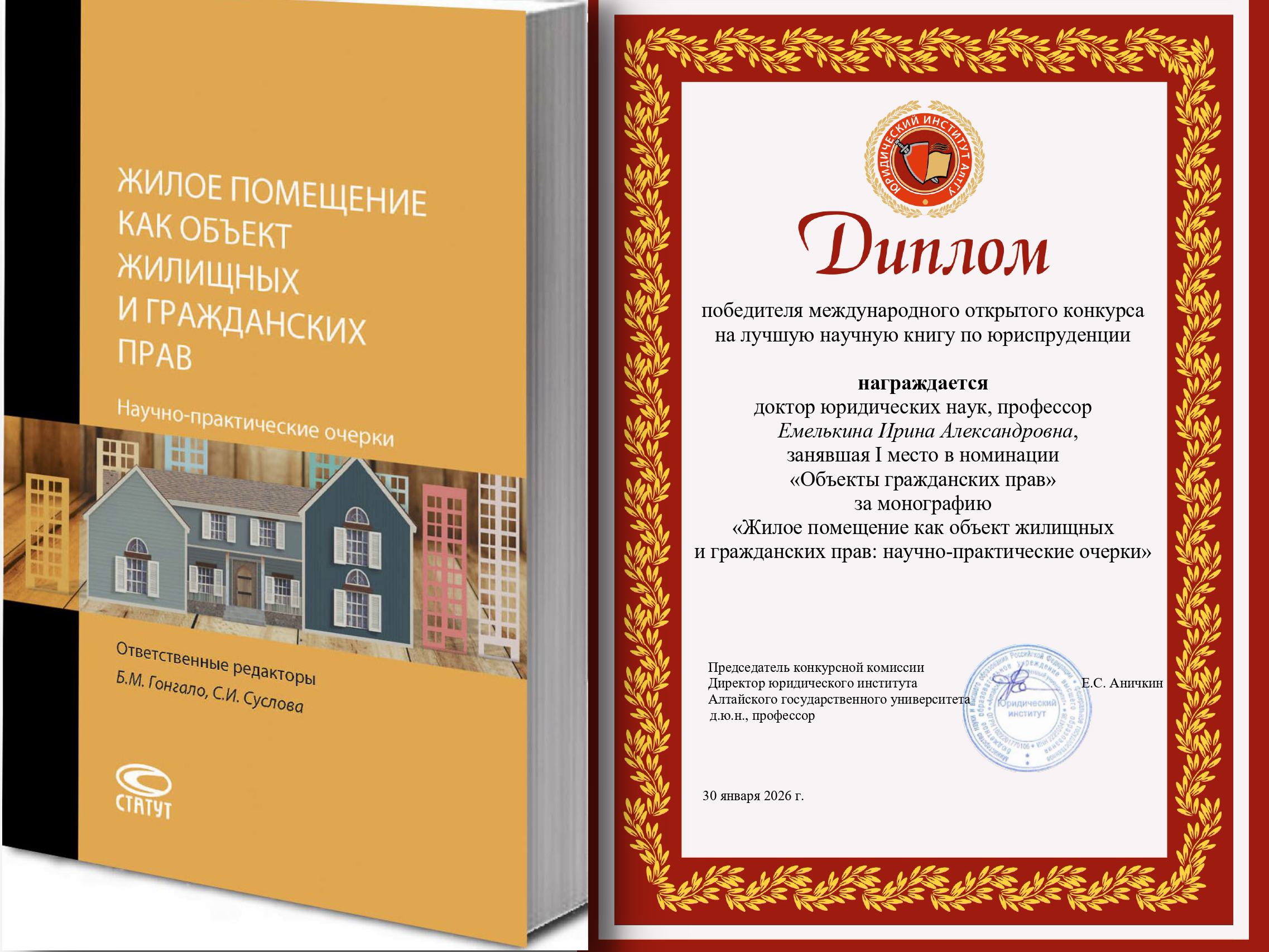 Монография «Жилое помещение как объект жилищных и гражданских прав: научно-практические очерки» (под ред. Б. М. Гонгало, С. И. Сусловой; М.: Статут, 2025. – 212 с.) заняла 1-е место в номинации «Объекты гражданских прав».